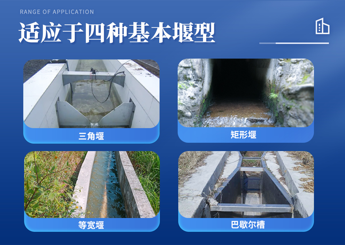適應(yīng)于四種基本堰型:三角堰、 矩形堰、 等寬堰、 巴歇爾槽