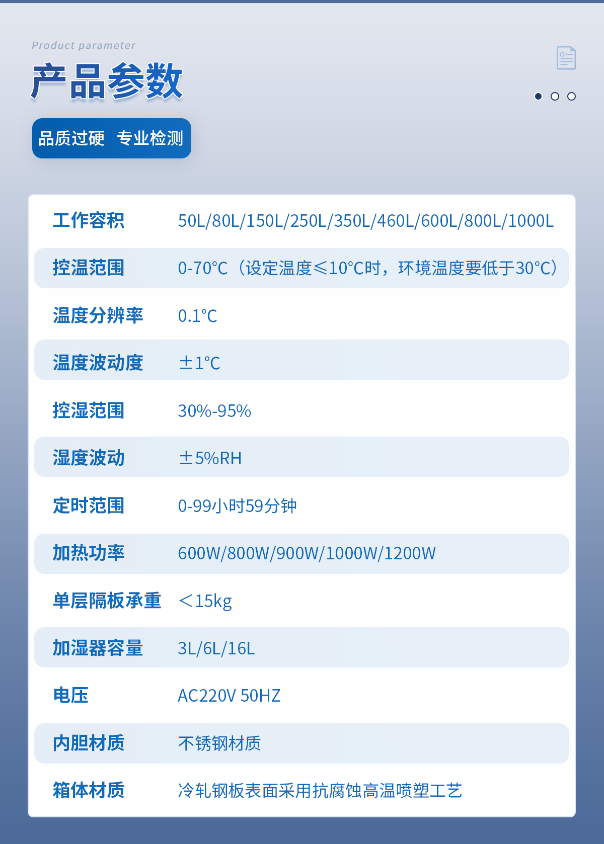 | 工作容積:250L | 箱內(nèi)照明:日光燈 | 控溫范圍:0-70℃(設(shè)定溫度≤10℃時(shí)環(huán)境溫度要低于30℃) | 程序控制:24段 | 溫度分辨率:0.1℃ | 溫度波動(dòng)度:±0.5℃ | 控濕范圍:30%-95% | 定時(shí)范圍:0-99小時(shí)59分鐘 | 加熱功率:900W | 內(nèi)箱尺寸 寬*深*高(cm):51*48*96 | 外箱尺寸 寬*深*高(cm):64*70*152 | 隔板層數(shù)(標(biāo)配):2層 | 層間隔/mm:36 | 卡槽層數(shù):13 | 加濕器容量(標(biāo)配):3L | 單層隔板承重:<15kg | 底部總承重:30kg | 電壓:AC220V 50HZ | 整機(jī)重量:96kg | 內(nèi)膽材質(zhì):不銹鋼材質(zhì) | 箱體材質(zhì):冷軋鋼板表面采用抗腐蝕高溫噴塑工藝 |