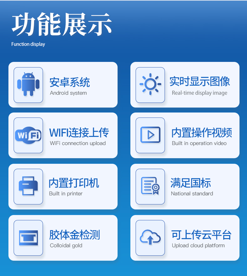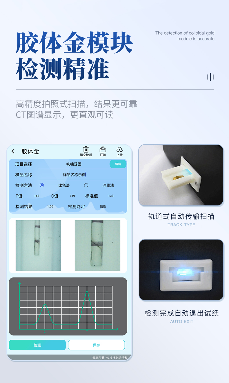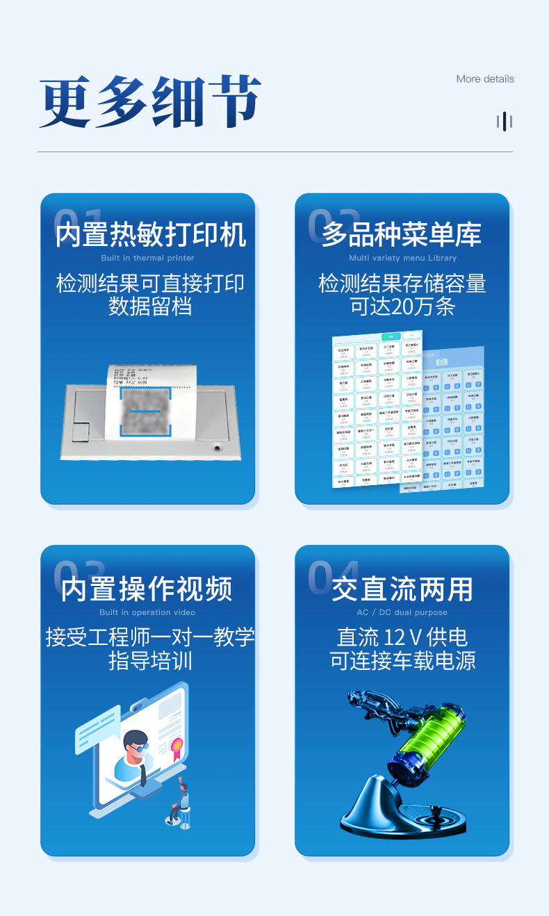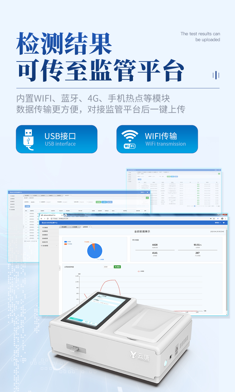 | 儀器采用10.1英寸液晶觸摸屏顯,搭配運(yùn)行安卓智能操作系統(tǒng),主控芯片采用ARM Cortex-A7,RK3288/4核處理器,主頻1.88Ghz,運(yùn)轉(zhuǎn)速度更快速,性能更強(qiáng)。 | 儀器功能包括:膠體金檢測模塊、數(shù)字化管理模塊、無線通訊模塊等,可以滿足同一軟件下實(shí)現(xiàn)所有檢測項(xiàng)目的檢測,并在同一窗口展示檢測結(jié)果。 | 一體化便攜式快檢設(shè)備,采用交直流兩用供電方式,可連接車載電源,配備6ah大容量充電鋰電池,可以滿足現(xiàn)場及流動(dòng)檢測使用的需求。儀器尺寸:43×35×20cm, 主機(jī)凈重:5.1kg | 系統(tǒng)自帶數(shù)據(jù)集成模塊,設(shè)備首頁自動(dòng)統(tǒng)計(jì)檢測數(shù)據(jù)包含:周檢測數(shù)據(jù)、月檢測數(shù)據(jù),全部檢測總數(shù)量,均包含檢測總數(shù),合格數(shù),不合格數(shù),以及相關(guān)柱形分析圖,對各項(xiàng)檢測數(shù)據(jù)清晰掌握,無需電腦查詢,更加快捷直觀。 | 儀器具有任務(wù)預(yù)設(shè)模塊,可在樣品送檢前提前預(yù)設(shè)樣品名稱、檢測指標(biāo)、送檢單位等信息,樣品送檢時(shí)一鍵調(diào)取保存信息,檢測更加方便快捷。 | 膠體金檢測模塊: 直插式自動(dòng)掃描方式,可實(shí)時(shí)顯示金標(biāo)卡實(shí)時(shí)圖像,系統(tǒng)自動(dòng)分析并呈現(xiàn)出CT曲線圖,CT線自動(dòng)識(shí)別,無需手動(dòng)調(diào)整,完成檢測后自動(dòng)退出檢測卡。 結(jié)果判定線可修改,對照值標(biāo)定值可保存,斷電不丟失數(shù)據(jù)。 兼容市場上其他膠體金卡,使用耗材不受限制,極大增強(qiáng)用戶使用體驗(yàn)。 | 儀器檢測系統(tǒng)擁有龐大數(shù)據(jù)庫,并且構(gòu)建了完善的檢索、修訂功能。食品庫涵蓋多種樣品名稱,可按需添加或刪除、編輯樣品名稱;產(chǎn)品數(shù)據(jù)庫以及歷史檢測記錄支持一鍵檢索功能。 | 系統(tǒng)打印自定義化,打印格式多樣化,產(chǎn)品合格證(國家標(biāo)準(zhǔn)要求),二維碼,抽樣信息、檢測信息,受檢信息、復(fù)核信息、抽樣日期、檢測日期等信息結(jié)果,可按需求自行設(shè)置打印內(nèi)容。 | A4紙版本報(bào)告打印功能(可選配):設(shè)備擁有兩種結(jié)果展示方式,可以自動(dòng)生成A4打印模板和小票打印模板兩種樣式,可通過WiFi及網(wǎng)線等方式鏈接外置打印機(jī)可進(jìn)行打印 | 儀器具有 wifi 聯(lián)網(wǎng)上傳、RJ45網(wǎng)線連接功能,可以快速上傳數(shù)據(jù)。同步對接監(jiān)管平臺(tái),數(shù)據(jù)可局域網(wǎng)和互聯(lián)網(wǎng)數(shù)據(jù)上傳,檢測結(jié)果直接傳至食品安全監(jiān)管平臺(tái)。進(jìn)行區(qū)域食品安全監(jiān)管及大數(shù)據(jù)分析處理與數(shù)據(jù)統(tǒng)計(jì),檢測區(qū)域食品安全長短期動(dòng)態(tài),達(dá)到食品安全問題預(yù)估、預(yù)警。 | 設(shè)備支持U盤存儲(chǔ),標(biāo)準(zhǔn)USB接口,免驅(qū)動(dòng)安裝。檢測結(jié)果存儲(chǔ)容量20萬條以上,可生成Excel表格,進(jìn)行一鍵拷貝,并具有登錄保護(hù)功能,可設(shè)置用戶名及密碼,規(guī)范不同人員操作權(quán)限,防止非工作人員操作,并且可以進(jìn)行重新校準(zhǔn)、鎖定、恢復(fù)出廠設(shè)置功能。儀器固件可升級,后期檢測項(xiàng)目可擴(kuò)充。 | 儀器具備遠(yuǎn)程升級功能,可定向分客戶分儀器更新,開機(jī)后自動(dòng)更新,并可持續(xù)性免費(fèi)更新系統(tǒng)版本,無需像傳統(tǒng)產(chǎn)品返廠更新,節(jié)省時(shí)間及人力成本并避免了物流運(yùn)輸返廠升級導(dǎo)致設(shè)備損壞的潛在風(fēng)險(xiǎn)。 |