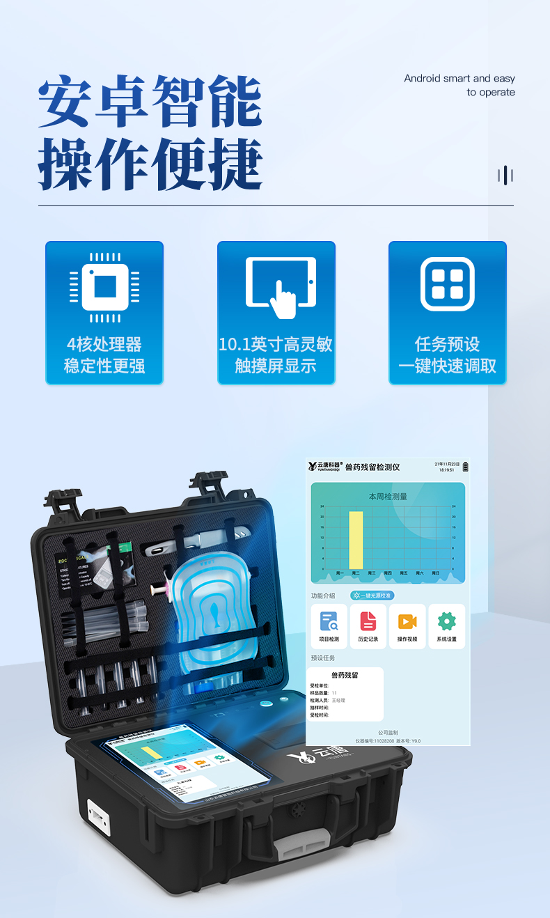 山東云唐智能科技有限公司生產(chǎn)的高智能獸藥殘留檢測儀可快速檢測瘦肉精激素類食品安全項(xiàng)目,包含鹽酸克倫特羅、沙丁胺醇、萊克多巴胺、己烯雌酚,獸藥殘留、抗生素類殘留、真菌毒素類殘留、動(dòng)物疫病類等檢測