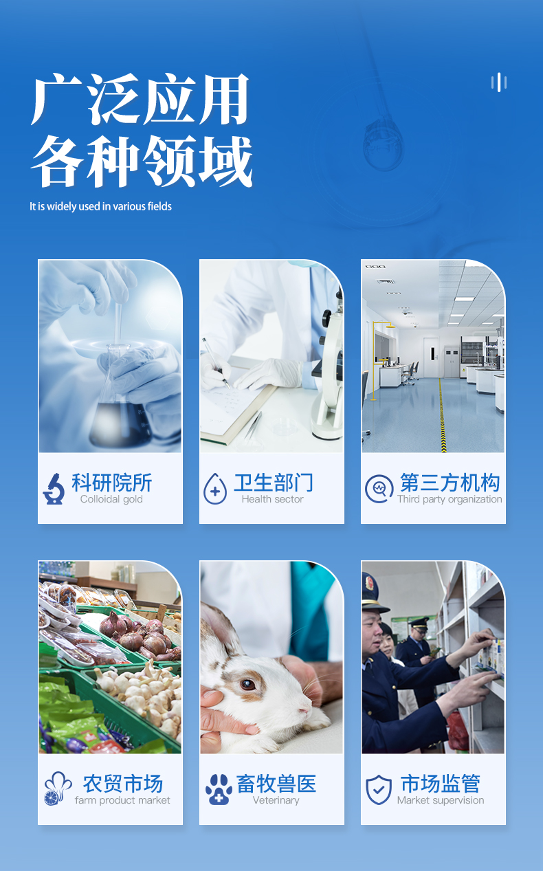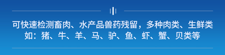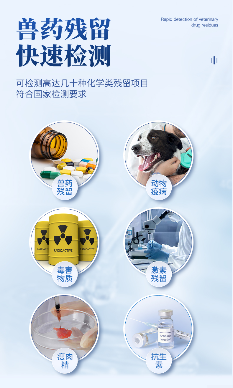 | 瘦肉精激素:鹽酸克倫特羅、沙丁胺醇、萊克多巴胺、己烯雌酚等 | 抗生素殘留:四環(huán)素類、硝基呋喃類、磺胺類、β-興奮劑類、沙星類、磺胺類、喹諾酮類,甲砜霉素,氟苯尼考,金剛烷胺、替米考星、慶大霉素、林可霉素、鏈霉素、恩諾沙星、環(huán)丙沙星、頭孢啦啶、青霉素、阿莫西林等 | 水產(chǎn)品安全類:孔雀石綠、氯霉素、呋喃妥因、呋喃西林、呋喃它酮、呋喃唑酮等 | 蛋類藥物殘留:氯霉素,四環(huán)素,磺胺類,喹諾酮類,呋喃西林,呋喃它酮,呋喃妥因,呋喃唑酮,氟苯尼考,阿莫西林、頭孢氨芐、紅霉素、鏈霉素等 | 動(dòng)物疫病類:禽流感、新城疫、牛羊口蹄疫、牛羊結(jié)核病、牛羊包蟲、牛羊布病、小反芻獸、豬藍(lán)耳病毒、豬瘟病毒、豬偽狂犬病毒、豬細(xì)小、豬圓環(huán)、犬細(xì)小病毒、犬瘟熱病毒、犬狂犬病毒等 | 真菌毒素殘留:食用油、糧食及飼料中黃曲霉毒素B1、黃曲霉毒素總量,奶中黃曲霉毒素M1、嘔吐毒素、玉米赤霉烯酮、赭曲霉毒素A、T2毒素、伏馬毒素等 |