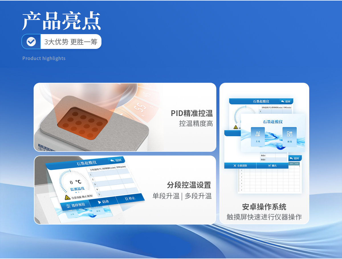 使用5寸彩色觸摸屏進行儀器操作,配備安卓操作系統,方便快捷。 采用PID 控溫技術,控溫精度高,升溫速度快, 從室溫到260℃僅需25分鐘。 分段控溫設置,即可單段升溫,也可多段升溫,設置靈活,儀器將自動按順序完成。更適于易產生泡沫的樣品。 采用優質石墨爐內芯,平均溫差較小,樣品效果一致性好,熱傳導效率更高。石墨塊具有特氟龍涂層,耐腐蝕,延長使用壽命。