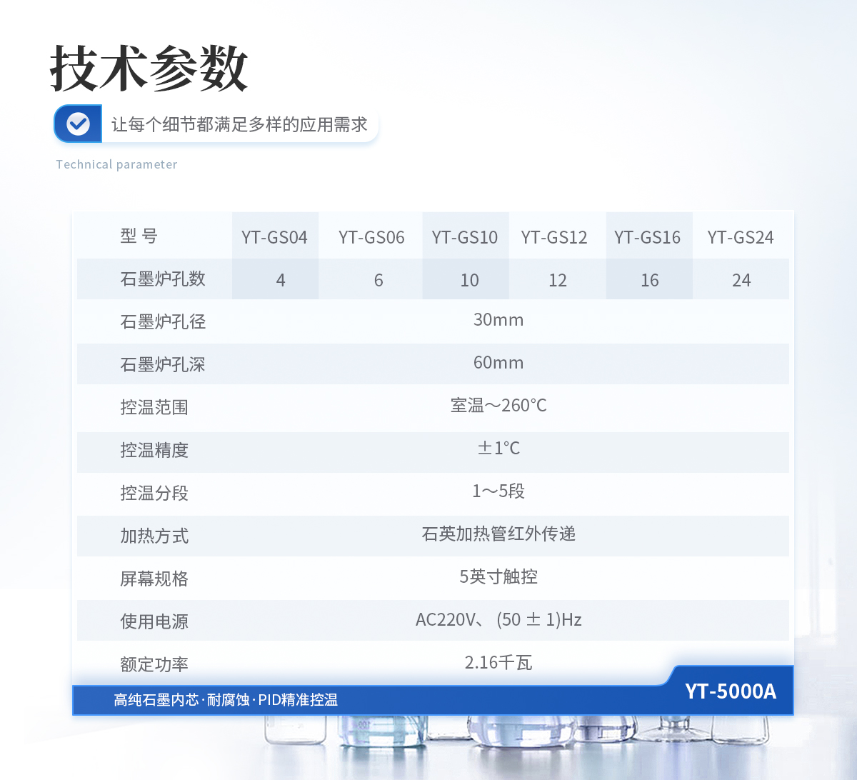 石墨爐孔:孔徑30mm,孔深60mm,孔數(shù)6×4 控溫范圍:室溫~260℃ 控溫精度:±1℃ 控溫分段:1~5段 加熱方式:石英加熱管紅外傳遞 屏幕規(guī)格:5寸觸控 主機外型尺寸:寬567mm×深460mm×高168mm 使用電源:AC220V、 (50 ± 1)Hz 額定功率:2.16千瓦