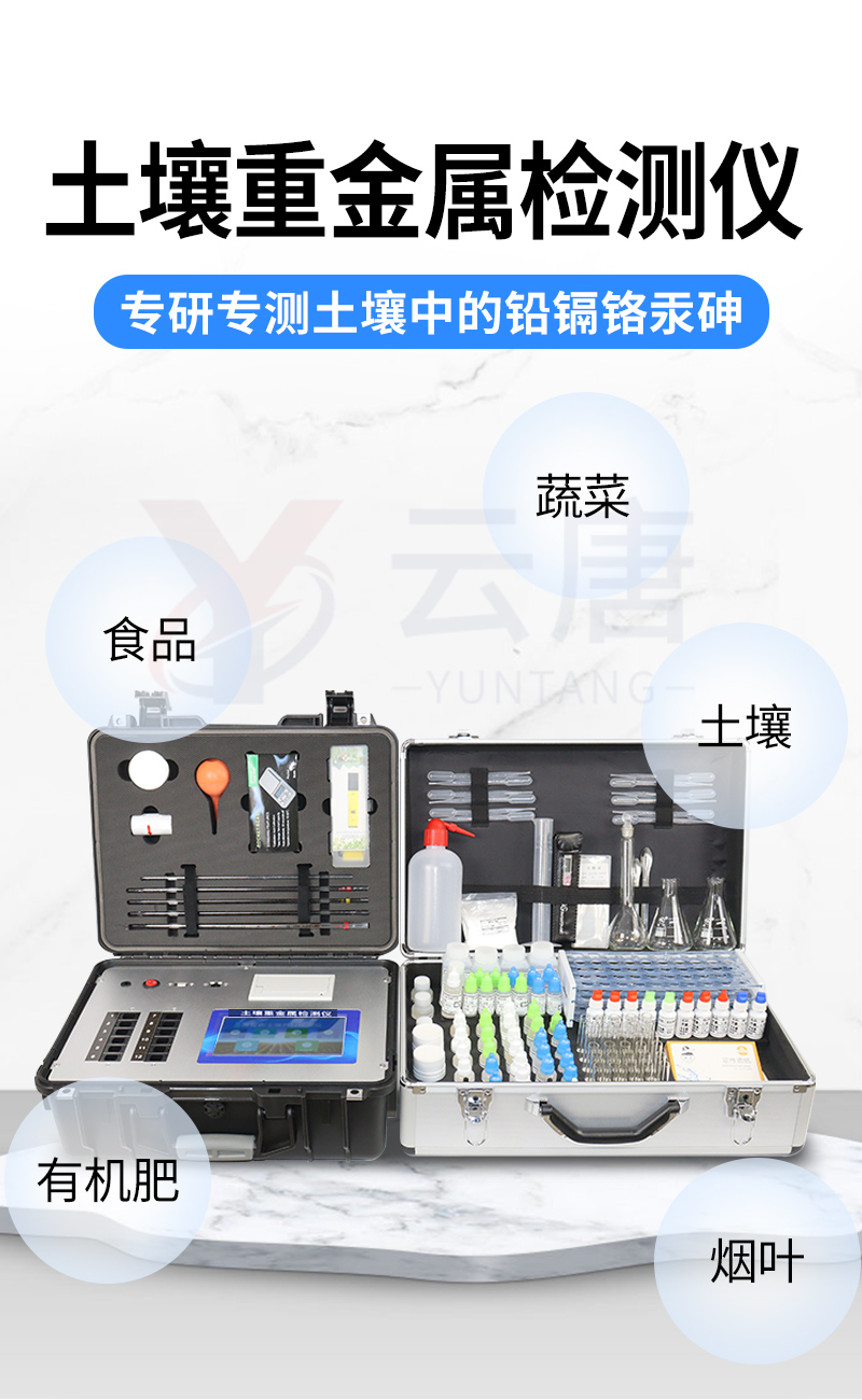 土壤重金屬污染問題日益嚴重,造成土壤耕作層內的鎘、銅、砷、鉻、汞、鐵、鋅、錳、銅、鋁等重金屬大量富積、積累,成為當下面臨的主要環境問題之一。土壤中的重金屬通過在作物體內富集進入食物鏈,對人畜健康造成嚴重威脅。有色金屬礦山的開采、 工業“三廢”的排放、含重金屬廢棄物堆積、農業生產中的污水灌溉,農用化學藥品的不合理使用等,都可能導致有害重金屬元素直接或間接進入土壤,導致土壤、作物、果蔬、水質、水產品等重金屬含量嚴重超標。但是當前重金屬測定方法測定速度慢、步驟繁瑣且儀器昂貴?;谶@種形勢,我們開發出了重金屬快速測定方法。