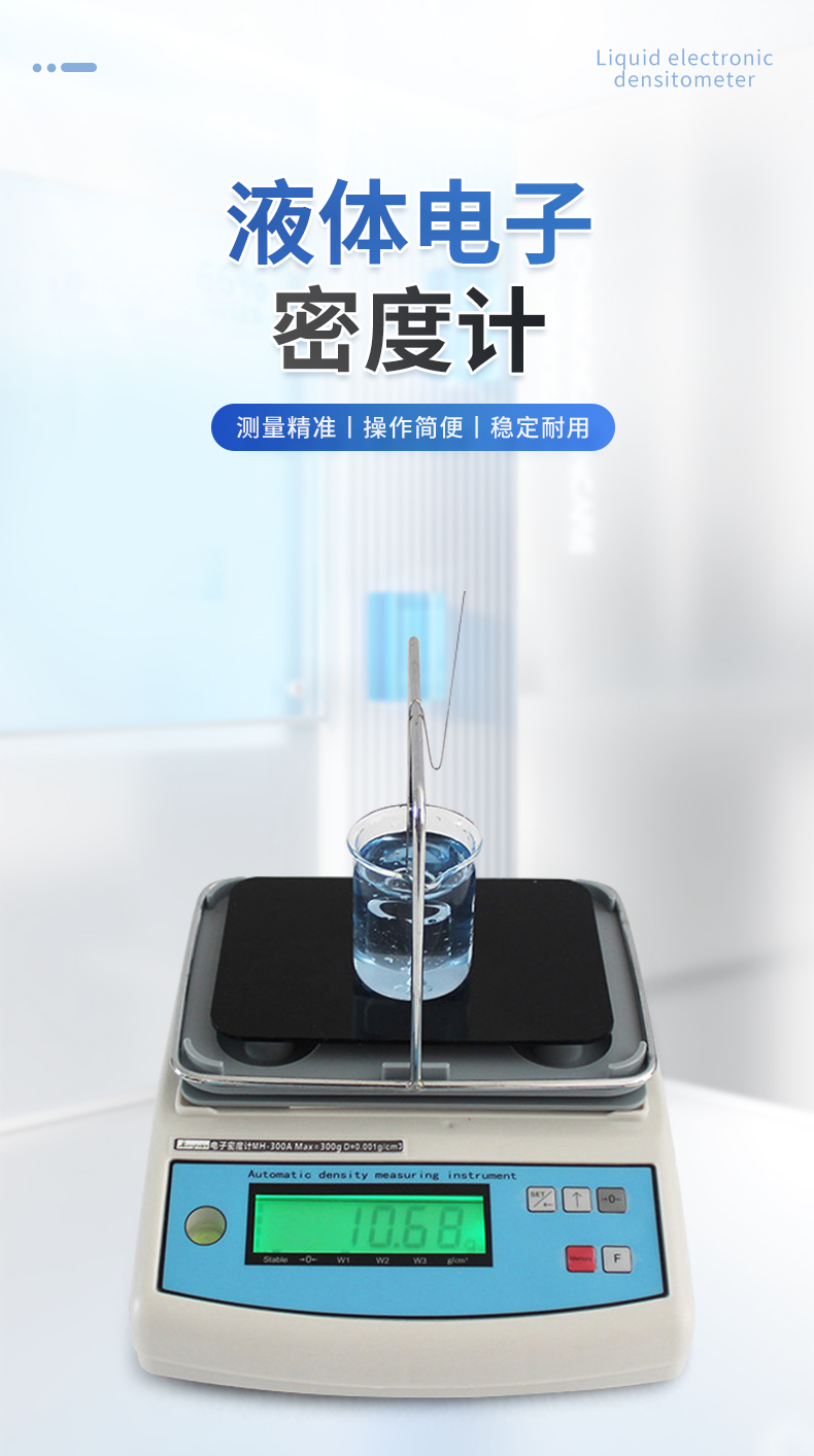 1、進入液體密度測試模式后,狀態顯示區顯示“AIR”。 將掛鉤懸掛在液體專用架正中央,按下“清零”鍵,扣除掛鉤重量。2、使用掛鉤將標準的玻璃砝碼鉤起,穩定后,按“取樣”鍵。確認玻璃砝碼在空氣中的重量時,顯示“SAV-A”,表示已記錄空氣中的重量值。3、此時狀態顯示區顯示“LIq”。取下玻璃砝碼。并取50ml待測液體樣品到燒杯中,將玻璃砝碼放入液體中。4、將燒杯放在支撐板的正中央,使用掛鉤將玻璃砝碼鉤起(確定測量液體有高于玻璃砝碼,而且玻璃砝碼不可以碰到燒杯壁),穩定后,按“取樣”鍵。確認玻璃砝碼在液體中的重量時,顯示“SAV-B”,表示已記錄液體中的重量值。5、自動顯示被測液體的密度值。按“模式”鍵,可切換顯示樣品的濃度值。7、按“設置”鍵返回到待測狀態,可進行下一組樣品的測量。(連續測試時,要將掛鉤及玻璃砝碼清潔干凈)儀器尺寸:195*220*190mm包裝尺寸:430*200*360mm包裝重量:4kg