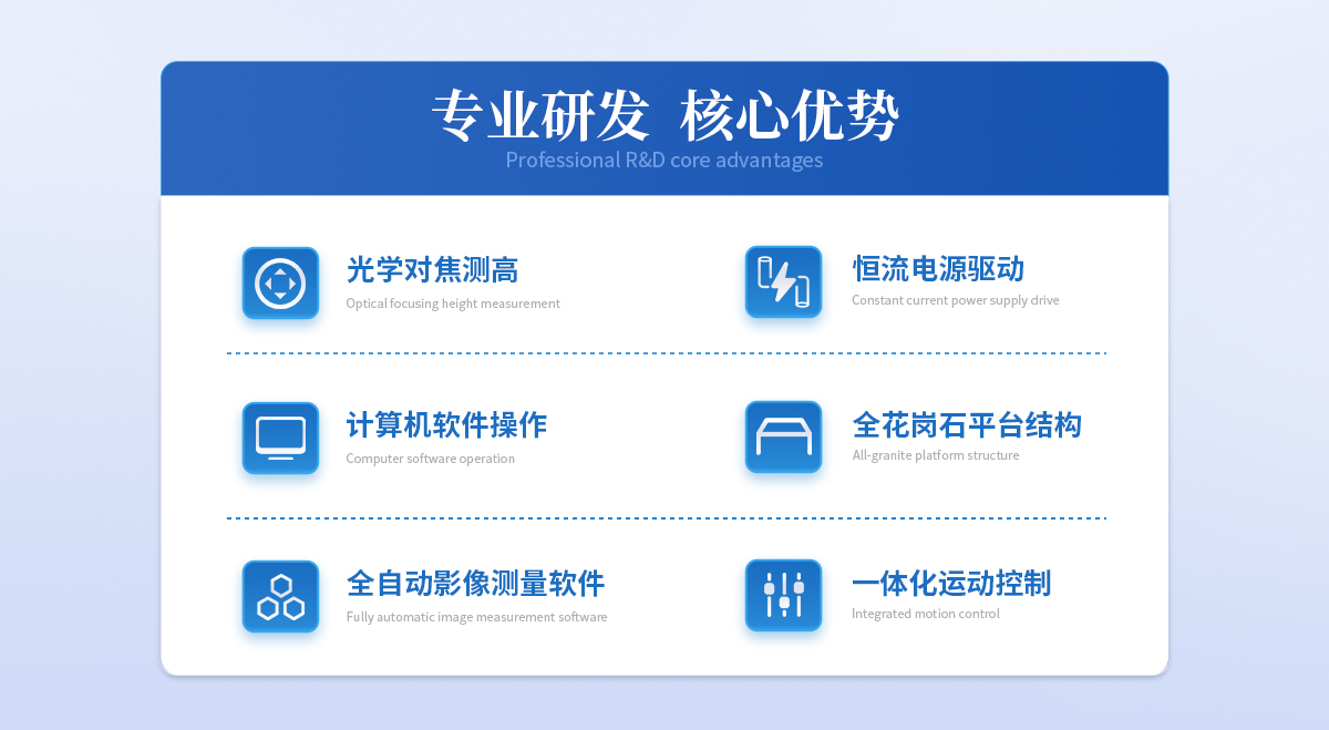 | 1、智慧燈光:鼠標(biāo)單擊對應(yīng)的圖標(biāo),軟件自動調(diào)節(jié)合適的燈光亮度。使用過程中方便、**。 | 2、測量宏功能:將一連串的測量構(gòu)造命令關(guān)聯(lián)到一個按鈕上,點擊按鈕,即開始執(zhí)行宏測量功能,宏測量功能會自動完成構(gòu)造動作,減少用戶操作鼠標(biāo)次數(shù),提高工作效率。 | 3、導(dǎo)入CAD圖紙測量:設(shè)置跟圖紙一致的坐標(biāo)系,調(diào)節(jié)好燈光,導(dǎo)入圖紙及完成編程步驟。對于平面尺寸測量非常**。 | 4、計算器功能:測量過程中會遇到不能直接通過測量得出的數(shù)據(jù)。軟件這里提供了一些基本表達式:絕對值、三角函數(shù)、反三角函數(shù)、平均值、**值、*小值、開平方、iF表達式等。 | 5、SPC功能:專業(yè)的 SPC 軟件,測量軟件和SPC 軟件無縫鏈接, 自動將數(shù)據(jù)導(dǎo)入 SPC 數(shù)據(jù)庫,其圖 表及數(shù)據(jù)可打印和導(dǎo)入到 EXCEL 表格 | 6、3D測量功能:需加裝選配探針或點激光 |