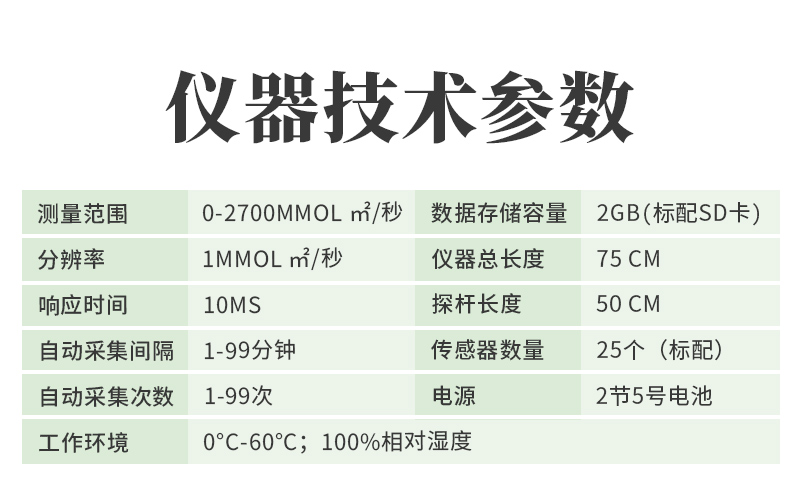植物冠層圖像分析儀由魚眼圖像捕捉探頭(由魚眼鏡頭及CCD圖像傳感器組成)、內置25個PAR傳感器的測量桿(搖臂)、筆記本電腦、圖像采集軟件及圖像 分析軟件、高容量的可充電電池組組成。魚眼探頭安裝在一個很輕的搖臂的頂端,它可以獲取150°視角的魚眼圖像。圖像的顯示和存貯由配置的筆記本計算機完 成。