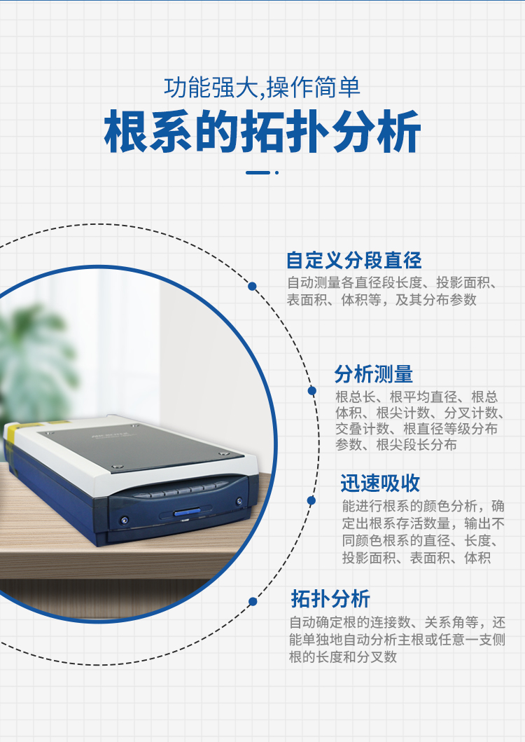 WinRHIZO軟件可以讀取TIFF,JPEG標準格式的圖像。針對獲取的圖像,利用插入加密狗解密的軟件,同時配合廠家針對掃描儀配置的Scanner.cal校準文件,對掃描獲得的高質量根系圖像進行分析。采用非統計學方法測量計算出交叉重疊部分根系長度、直徑、面積、體積、根尖等基本的形態學參數;利用軟件的色彩等級分析功能,還可以對根系顏色進行分析,從而進行根系存活數量、根系生長和營養狀況等方面研究;利用軟件的**分析功能,還可以對完整的植物根系圖像進行根系連接分析(研究根系分支角度、連通性等形態特征)、根系拓撲分析(研究根系連接數量、路徑長度)和根系分級伸展分析(記錄根系整體等級分布情況)。從而滿足研究者針對植物根系不同類別和層次的研究。