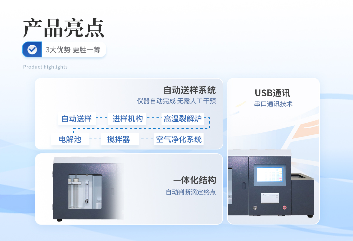 1、 手自一體化自動送樣系統,將自動送樣、進樣機構、高溫裂解爐、電解池、攪拌器、空氣凈化系統等部件巧妙地結合在一起,使儀器結構更加緊湊,更加合理、更加穩定。可在線式插隊添加樣品,無需人工送樣,自動化程度高,若樣品少也可采用手動送樣方式。2、采用—體化結構,自動判斷滴定終點,縮短了實驗時間。所有關鍵部件均采用了設計理念及進行了嚴格的控制,確保儀器能長時間穩定運行。3、采用特別的數據采集網絡及多級校正技術,確保高、中、低硫含量測試結果的準確性。4、送樣機構采用電子電解液分子濃度采集電路,可靠性高,不會產生過電解現象。5、串口通訊技術,可采用usb通訊,兼容性好,具有廣泛的適用性。6、自由設置送樣時間及預置溫度,采用進口霍爾元件控制送樣位置。7、采用剛玉瓷舟,減少卡樣的可能。一次可放1-24個樣由程序控制實現自動升溫、控溫、送樣、測定,結果自動存盤、自動打印,并可中途在線式插隊添加試樣,大大地提高了工作效率,真正實現無人值守;8、采用庫侖滴定法進行測定,測定時間可根據不同試樣自動判斷,速度優于艾士卡重量分析法和高溫燃燒中和法;