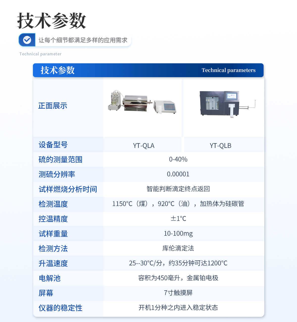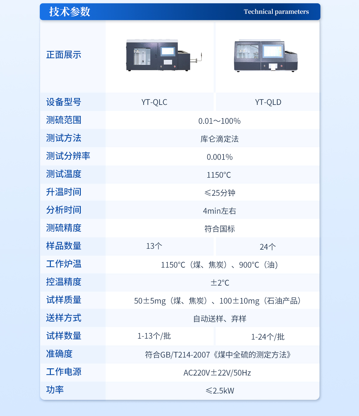 測硫范圍:0.01~100%測試方法:庫侖滴定法測試分辨率:0.001%測試溫度:1150℃升溫時間:≤25分鐘分析時間:4min左右測硫精度:符合國標樣品數量:24個工作爐溫:1150℃(煤、焦炭)、900℃(油)控溫精度:±2℃試樣質量:50±5mg(煤、焦炭)、100±10mg(石油產品)送樣方式:自動送樣、棄樣試樣數量:1-24個/批,試驗過程可添加/替換試樣準確度:符合GB/T214-2007《煤中全硫的測定方法》工作電源:AC220V±22V/50Hz  功率:≤2.5kW